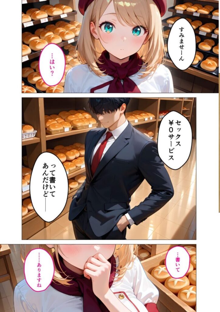 「この前伝えたあのサービスのことなんだけど……お願いね…」「あ……私にできるかな…あはは…」昔からパン屋で働くのが夢で、でも何度挑戦してもダメで…だからこそ雇ってくれた店長さんに恩返ししないと!サービス自体は嫌だけど……私に出来ることがあるなら頑張らなきゃ!「すみませーん。セックス¥0サービスって書いてあんだけど――」「パンご購入のお客様限定のサービスです…」「ふ〜んじゃあ…」今日来る人みんなサービス求めてくるよ……!でも、雇ってくれた恩返し頑張らなきゃ……!本編45P+AIイラスト5P収録!【注意事項】※本作品のシチュエーションは全てフィクションです。登場する人物や設定等は、すべて架空のものとなります。※この作品内に登場するキャラクターは全員20歳以上です。※本作品はAIによる生成画像を使用して制作しております。※犯罪、その他違法行為を美化または助長する意図はございません。