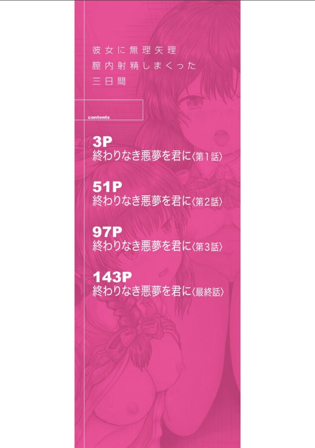 【第1話試し読み付き!!】好きで…好きで…好きでたまらない…だから、どうしても、君を犯したい…!!主人公は落とし物を拾ってくれた近所の美少女「ゆいか」に一目惚れして以来、彼女を盗撮し続けている。とある雨の日にずぶ濡れのゆいかに欲情し、抑えがきかなくなった主人公は家に押し入り、無理矢理彼女の処女マ〇コを●すのだった!そして両親が暫く家に帰らない事を知り、居座る主人公。そこに何も知らずに帰宅したゆいかの姉も、主人公の餌食となる…!その姉妹の変化に気が付いた友人が家への侵入を試みるのだが…!!何もない、何もしない、何もできないオレの人生に絶頂期がやってきた。レ●プで彼女たちを喜ばせてあげる!!【収録作品】終わりなき悪夢を君に〈全4話〉【特典】・メッセージペーパー・表紙、裏表紙線画