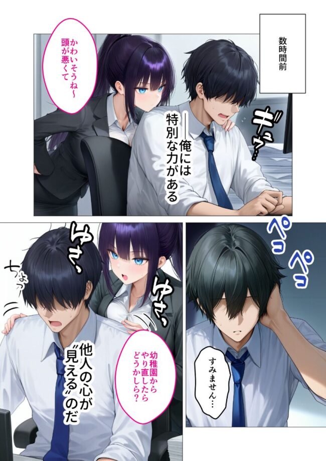 「●●●からやり直したらどうかしら?」俺・佐藤はうだつの上がらない気弱なサラリーマン。営業成績の悪さを見抜かれ、今日も社長秘書・若山ミレイに見下されていた。そんな俺には誰にも言えない、特別な能力がある。【えっちしたいえっちしたいえっちしたい!】他人の悪意や欲望などの汚い心の声の形を、はっきりと見ることができるのだ。「急にナニ言い出すのよ!セクハラで訴えるわよ…!」【何?なに…?これから私どうされちゃうの…?】「こんな所でさせるなんて…へんたい…!最低…ッ!」【社長秘書快楽堕ちASMRみたい…!さいっこう!】まさかハイスペックな社長秘書がこんなド変態女だったとは……。その欲望、俺が叶えてやろう。本編45P+AIイラスト5P収録!【注意事項】※本作品のシチュエーションは全てフィクションです。登場する人物や設定等は、すべて架空のものとなります。※この作品内に登場するキャラクターは全員20歳以上です。※本作品はAIによる生成画像を使用して制作しております。※犯罪、その他違法行為を美化または助長する意図はございません。