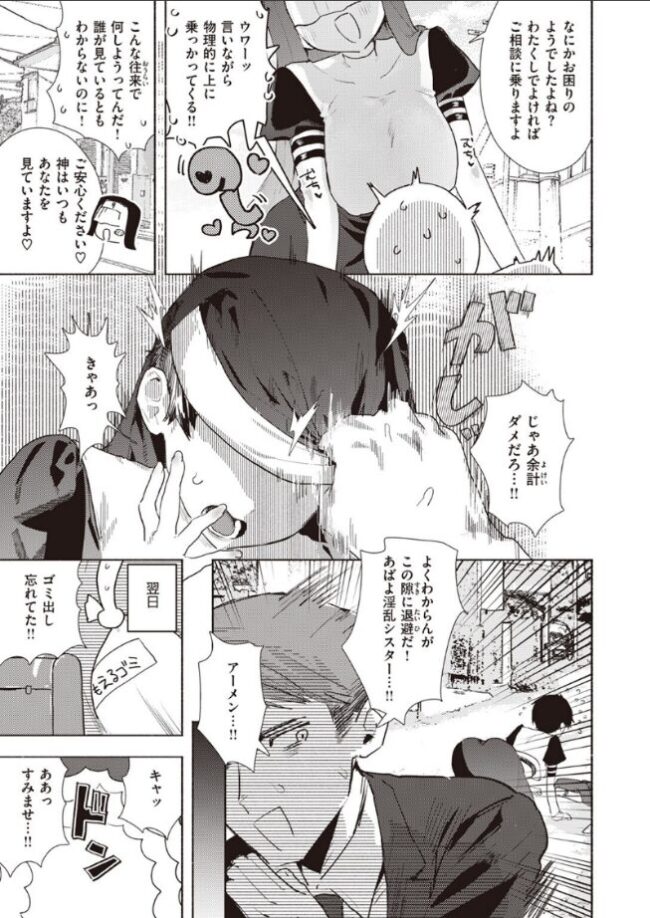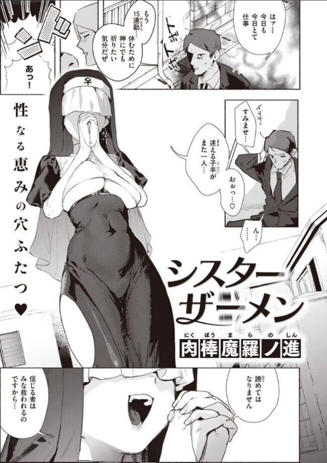 「諦めてはなりません 信じる者はみな救われるのですから…」シスターザーメンに相談だ!道端で偶然ぶつかった、メカクレ・爆乳・激エロ・シスターの《シスターザーメン》(???)。今日も神の御名(オンナ)のもとに、プリプリザーメンを搾り取る!その正体は……内気で無口なお隣さん!?