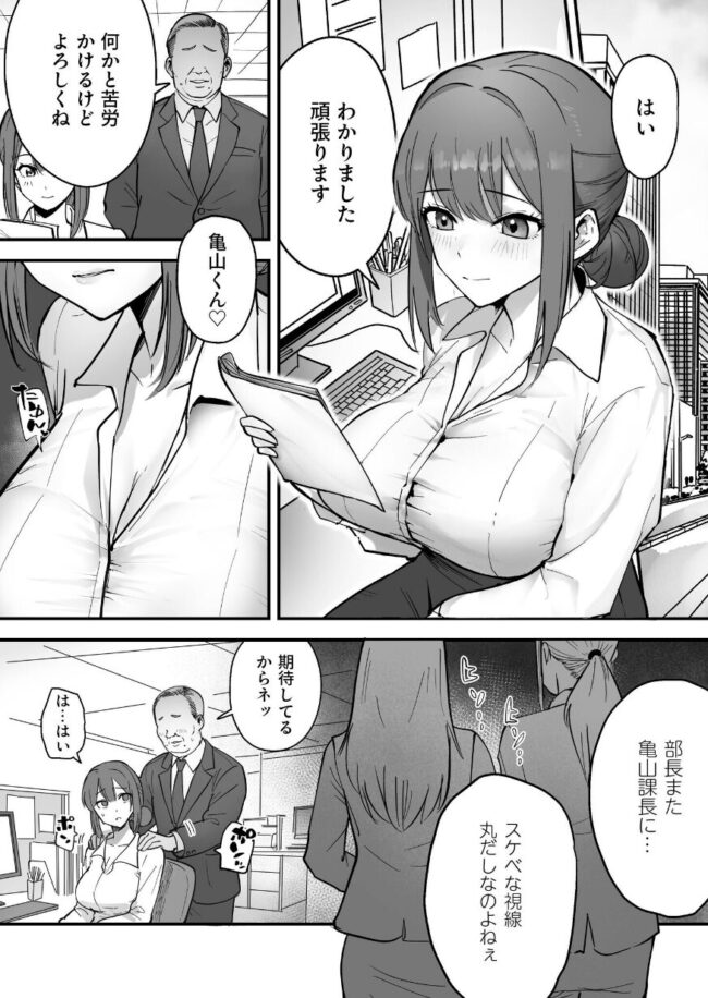 『残業オナニーしてる分際で何言ってんすか?』美人女上司・亀山は、部長からのセクハラに悩まされていた。そんな中、亀山は部下・タケルの何気ない行動でセクハラから助けられるが、助けられた安堵とは裏腹に部長に触られた場所から妙な熱が身体を駆け巡る。悶々としていると、偶然にも美人部下・かもめとチャラい部下・竿田の生々しいSEX現場を目撃し、亀山の身体は火照りが抑えきれなくなる…