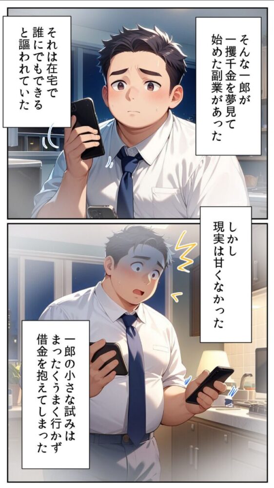 冴えない30代のサラリーマン、田中一郎は副業に失敗し、金に困っていた。にっちもさっちもいかず、家賃を滞納していると、巨乳美人の人妻大家、佐々木美和子から警告の手紙が…。何とかボーナスが入るまで待って欲しいとお願いしてみると、なんと彼女は体で払えという。一郎は動揺しながらも、この状況を打開するにはこれしかないと思い、彼女のもとを訪れた。すると、実父よりも年上の夫に放置されて飢えきっていた人妻・美和子は一郎を貪り、求め、さらに緊縛までも要求し…コミック本編74P+文字なし差分74P+おまけイラストたっぷり118P収録!【注意事項】※本作品に登場する人物は全て人工知能(AI)によって生成されたイラストであり、実在しません。※本作品はAI生成画像のため、手足など細かな部分が乱れている場合があります。※本作品に登場する人物は全員20歳以上です。※本作品はAIによる生成画像を使用して制作しております。※犯罪、その他違法行為を美化または助長する意図はございません。※本作品は、原作の本文・画像等を、権利者様から許諾を頂いております。(C)ラビットフット/とろとろコミック家賃を滞納したら、巨乳美女の人妻大家に体で支払わされた話〜背徳の借金返済・美しき人妻大家との淫らな契約〜—