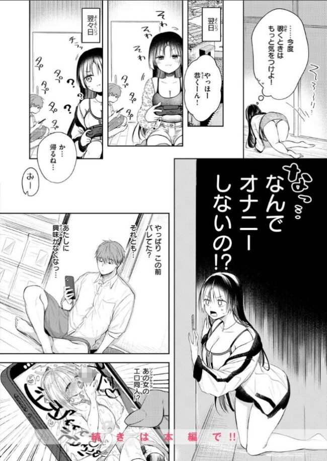 ――恭(きょう)くんにはさぁ…エロくておっぱいも大きくて…恭くんのことだけが大好きな幼なじみがいるじゃんよぉ…かまって欲しくておうちに行っても、ソシャゲに夢中で邪険にしてくる幼なじみの恭くん。もう…さ…あたしは全身でこーんなに好きって感じ出してるのに…ひどいよ…。でもね、あたし…恭くんがあたしの残り香でオナニーしてるってことも知ってるんだから……。そりゃ…初めて見ちゃったときは死ぬほどビビったけど…今はかなりムラムラしてくるの…ドア越しに恭くんを覗きながら、私も…ヤバいよねこんなのいつかバレ……。