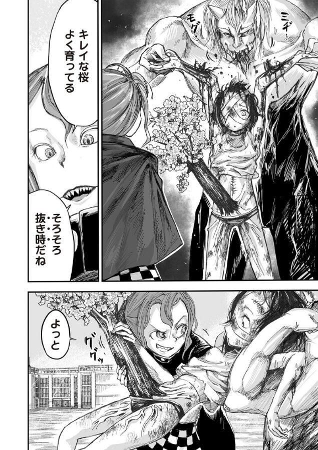 学校に巣食う妖怪に二度の敗北を喫した少女は身体を桜の樹に合成される。怪異たちの栄養として生き血をすすられ、下腹部に根付いた桜を強引にはぎ取られ、大量出血…新鮮な恐怖を求める怪異が少女の心を殺す絶望を求め、岩をも砕く超強力磁石が襲いかかる!