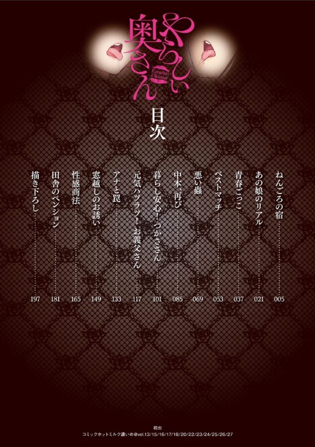 【エロ妻たちに男魂挿入!!】出張ではいつもビジネスホテルばかり利用していた八木は、たまには民宿でも泊まってみようかと思い、雰囲気の良さそうな宿に泊まってみることにした。出てきた女将は若くて美人。一つ気になるのは、予約完了のメールとは別に、民宿から来た「女将のおもてなし度をアップ」するというメールだった。てっきりお酌でもしてくれるのかと思ってた八木のところに来た女将は、いきなり着物の前をはだけて、美乳を露わにし、下の世話を申し出る。(ねんごろの宿)元同僚の看板受付嬢だった植松美咲ちゃんは、職場結婚して、今では瀬尾美咲になっている。宮内は美咲ちゃんの元へ、酔いつぶれた拓真を運んでやった。3年ぶりに会った美咲ちゃんは相変わらず可愛い。だがキャバクラ通いの拓真とうまくいってないらしい。「こんなことなら宮内君と一緒になっとけば良かったなぁ〜」なんて愚痴り出した美咲ちゃんは、宮内のために会社の制服を久しぶりに着てくれた。(あの娘のリアル)――全ページ加筆修正と描き下し7Pイラストギャラリー収録!誘い誘われしっぽり短編13作! <収録作品>ねんごろの宿/あの娘のリアル/青春ごっこ/ベストマッチ/悪い蟲/山本、再び/暮らし安心!つかささん/元気ハツラツ!お義父さん/アナと罠/窓越しのお願い/性感商法/田舎のペンション/描き下し※収録作品のうち「悪い蟲/田舎のペンション/性感商法/窓越しのお誘い/アナと罠/元気ハツラツ!お義父さん」はmswc「やらしい奥さん」に収録されています。ご確認の上ご購入ください。