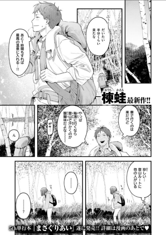 「不倫男にしっかり仕込まれちゃったから…」秘境の旅館へと向かう一人旅、お尻がぷりんとした眼鏡美女に遭遇。人に会うのも珍しい登山道で、目的地は同じ旅館の様子。なんだかヘバっているので同行を申し出たけど、迷惑そうに断られてしまった。やっちゃったかな〜とモヤモヤしながら到着し、露天風呂に行ってみると……湯船にぷかぷかと浮かぶは白いおっぱい。変態だと誹りを受けるも、男女入れ替え制の時間を勘違いしたのは向こうのほう。とはいえ気まずい。もう顔合わせらんない……と思って部屋で籠っていると、地酒を手土産にお詫びのご訪問が。話を聞くと、彼女は傷心旅行らしく、好きな人に奥さんがいたとか。(不倫温泉旅行……エッチじゃん…)なんて感想はしっかり見透かされていて……!?