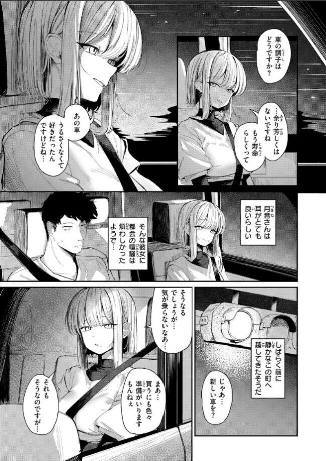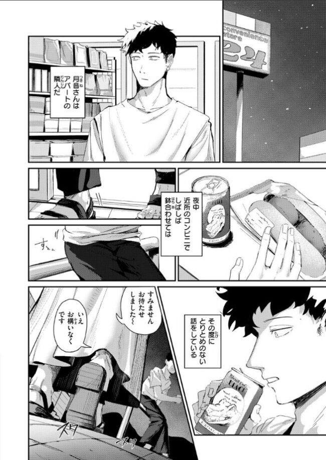 「…ふたりで 良い夜にしましょう…?」アパートの隣人で、夜中近所のコンビニで鉢合わせてはとりとめのない会話をする仲の月音(つきね)さん。最近は、月音さんの車の調子があまりよくないことから、自分の車で一緒にコンビニに行く関係へと発展。だけど今夜は、どこか含みのある言い方でなにかと自分を翻弄してくる助手席の月音さん。帰宅後、一旦落ち着こうと買ってきたものに目をやると、月音さんのものと思わしき鍵が入っていた。直接届けてほしいという月音さんへ、届けに部屋に入ると彼女が突然キスしてきて――
