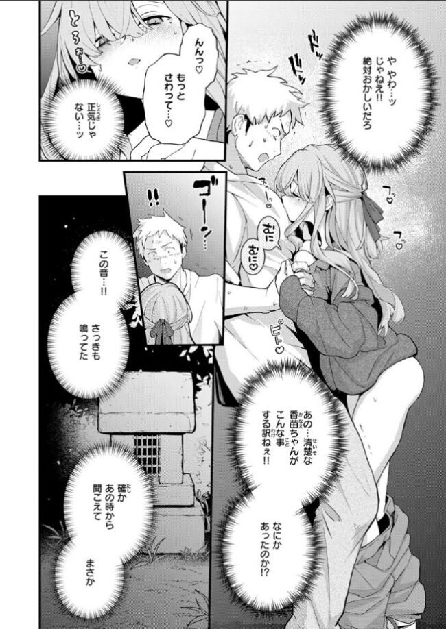 壊れた祠を直したらご利益があるかもよ。なんて幼馴染の香苗(かなえ)ちゃんの言葉を信じて律儀に直した俺。――香苗ちゃんと付き合えますように…!!と、お願いしたその日の夜、香苗ちゃんが「わたしえっちしにきたの」なんて迫ってきた!!あんな清楚な香苗ちゃんがそんなことする訳ないだろ!! と動揺している俺に、どこかうつろな香苗ちゃんは望みが叶ったら元に戻るよと発言。俺のせいでどエロくなってしまった香苗ちゃんを救うため、四六時中SEX漬けの日々が始まる――