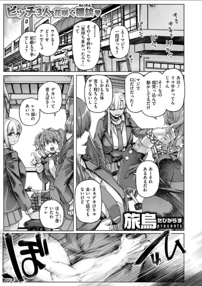 ギャル三人、絶賛猥談中!!そんなエロ話の中でトピックにあがったのが、レスリング部の西郡(にしごおり)が度を超えた巨根らしいという事だった。そんなにデカいんなら味あわせてもらわないとなァ!! とヤリマンの黒ギャル・リコは真正面から超ストレートに西郡を誘う。「一発ヤらしてよ 西郡」レスリングに明け暮れたゴリラのようなガタイの童貞の竿は果たしてどれほどのものなのか――!?