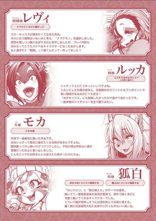旦那さま…お盛んですね実業家の屋敷で働く黒山羊亜人メイドさんは、陰毛が濃いので月に一度のお手入れはかかせない。そのあられもない姿を、密かに思いを寄せていたご主人様に見られてしまい…黒山羊メイドの剃毛、トカゲギャルのスプタン、タコ幼馴染娘の触手、ナマケモノ彼女のスローセックス、鯱娘と水中SEX、童貞くんをペロペロしたい犬のお姉さん、巨乳から貧乳まで変幻自在の狐女神様…種族を活かしたフェチなプレイが盛りだくさん♪オール人外 むせかえるほどフェチが詰まった一冊<収録作品>外楽カラーイラストレーション恋剃る黒山羊雪降る夜のレプタイル吸接近!! 〜恋は押し入れの中で〜ナマけてトロけて繋がって二人きりのオルカショー 〜この恋に溺れて〜けもの道おまつれ!!コンコン狐白さま嫁入れ!!コンコン狐白さまゲストイラストあとがき※収録作品のうち「けもの道/吸接近!! 〜恋は押し入れの中で〜/恋剃る黒山羊」は配信用コンテンツ「今宵、亜人はいかがでしょうか?」に収録されています。ご確認の上ご購入をお願いいたします