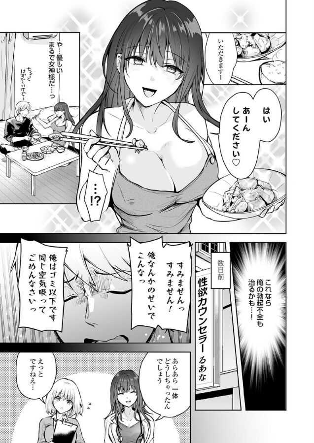 リアルな男女描写で魅せる・れいが贈る性の悩みシリーズ第四弾はEDに悩む男性に再び元気を取り戻してもらうため・るあな先生が患者さんとまさかの同棲!?性欲カウンセラーるあな先生の元を訪れたのは、風俗での体験がトラウマになってしまい勃起不全になってしまった男性。ED治療はるあな先生の得意中の得意分野だったが、彼の性器は固くなる事を忘れてしまったかのように無反応だった。さすがのるあな先生もこれには動揺し取り乱してしまうが「貴方も必ず救います、救ってみせます!」と新たに「ポリネシアンセックス」を行う治療方針を提案する。この性行為はスローセックスの一種でゆっくり日数をかけて二人で性欲を高め合うというもので、治療という名の男性とるあな先生との同棲生活がスタートするのだった。ポリネシアンセックスの心得としては、まずお互いの裸を見ながらコミュニケーションを取る事から始まる。やり取りを進める中ただひたすらに甘やかせてくれる・るあな先生。何年振りかに褒めてもらった男性は感動して抱きつきそのまま二人で寝床に入るが、息子は不調なままだった。そして三日目、るあな先生と一緒にご褒美でお風呂に入り体を洗われているとついにその時が訪れる!しかしまだ本番はしてもらえず、翌日まで持ち越された男性のアソコは暴発寸前に。るあな先生、これ以上は我慢の限界です!!