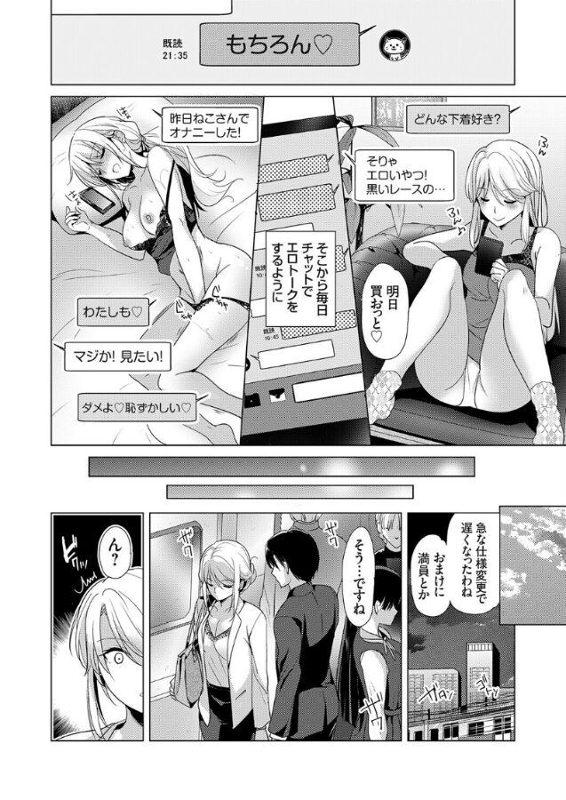 最新コミックス『あなたとわたしの恋色模様』が絶賛発売中のかたせなのがデレり描くツン系女上司エロチャット欲望解放社内恋愛エロコメディ!営業をやっているヒロインは毎月の営業成績も上位で順風満帆な会社員生活を送っていたが一つだけ不満があった。それは後輩の男子社員・相名(あいな)が営業先で毎回失態をやらかすので、そのフォローで精神をすり減らしている事だった。そんなある日、会社で偶然後輩のPC画面が目に入ったので見てみるとSNSをやっているようだったが、そこに書かれていたのはなんと「先輩白ワンピ綺麗でエロかった」「かわいいな〜」「彼氏いないんならチャンスあるかな〜」などの明らかに自分に対してのつぶやきの数々だった。そして後輩の気持ちを知ってしまったヒロインがとった行動は……新規アカウントを作成して後輩のSNSをフォローする事だった。相互フォローになって最初のうちは日常会話を楽しんでいただけだったが、いつの間にかエロい会話をするような仲になっていく二人。しかし、その時は突然訪れた。後輩と二人で営業回りに出た帰りの満員電車の中でヒロインの胸が誰かに急に揉まれたのだ。いったい誰がこんな事をと犯人の顔を見ると胸を揉んでいたのはなんと後輩だった!さらに後輩の口から衝撃の事実が告げられる。性癖を丸裸にされたツン系ヒロインはもうデレるしかないっ♪