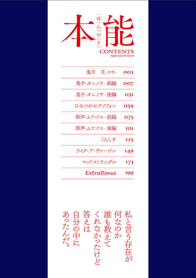 ★大ヒットメガストアコミックス「本能」がフルカラーで登場★フルカラー版はメロンブックス様・とらのあな様・コミックZIN様用の特典をカラー化して特別収録【女を捨てて雌になる】伝説の棋士の孫娘が入学した。将棋の腕は確かで超お高い自尊心。元プロの顧問教師と対戦するのだが、この教師も一癖も二癖もある強者。ワシに勝ったら高慢娘の風下になってやると対戦するのだが、将棋娘は負け続ける。そのたびに勃起マラをぶち込まれ、授業中もバイブ入れたままにされ、遂に娘が勝てそうな形成になったのに、果たして天才娘は卑劣教師に勝てるのか…。(鬼手 -オニノテ-)毎日の放課後、百合野はある資産家の主に求められ、小説の読み聞かせのアルバイトをするため、邸宅に通わなければならない。読み聞かせにはルールがあって、躰のどこを触られても、その日のノルマの終わりまで読むのが決まりだった。知らない男性に躰を触られる恐怖、嫌悪感…、でもそれが躰に馴染み、心まで溶かしていく。拒みたくても拒めない訳があり、作り替えられていく乙女。(斑声 -ムラゴエ-)――私と言う存在が何なのか誰も教えてくれなかったけど答えは自分の中にあったんだ。全ての概念をぶち壊す、えいとまん1stコミックス。<収録作品>鬼手 爻 -コウ-/鬼手 -オニノテ- 前編・後編/ひみつのセクソフォン/斑声 -ムラゴエ- 前編・後編/くらしす/ライク・ア・ヴァージン/マッドストラングル
