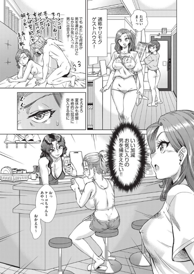 就活前の夏休み最後の息抜きで男漁り真っ最中の大学3年生、稲崎慧子が宿泊するのは海水浴場近くのゲストハウス。ここには男好きの淫乱女子たちがセックス相手を求めて集まる通称ヤリモクゲストハウス!彼女らの他にもA国からやってきたアニオタ淫乱バックパッカーのケイティ、大学のサークルを渡り歩きそこの男全員食ってサークルを崩壊させてきたサークルデストロイヤーの吉村あやね、そして酒とサーフィンと男が大好きなゲストハウスオーナーの高波法子。今日も新しい男性客がやってきたと朝からソワソワ。シュワールームに鍵をかけ忘れバッタリ遭遇したその男性客をヤリ部屋に誘い込み…!!