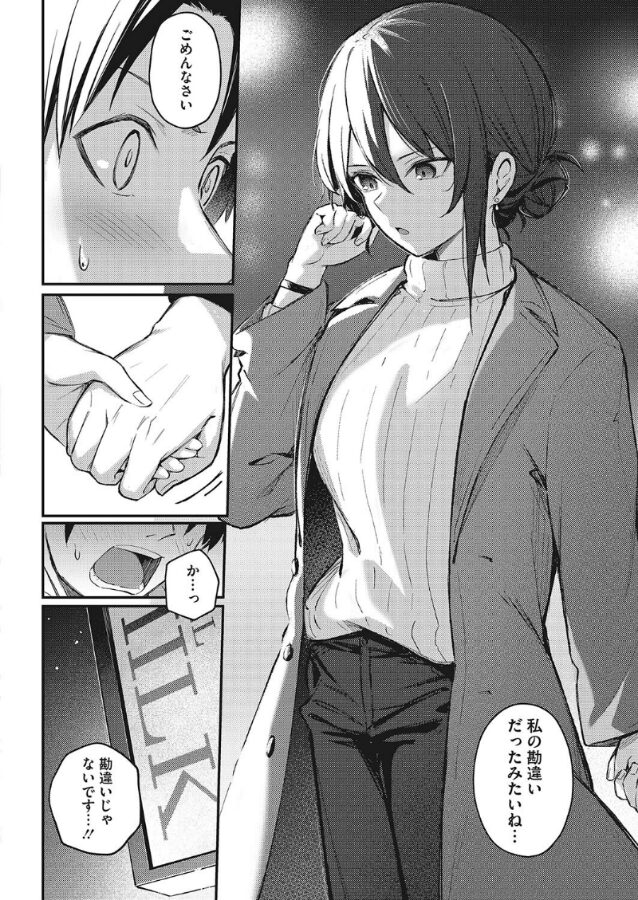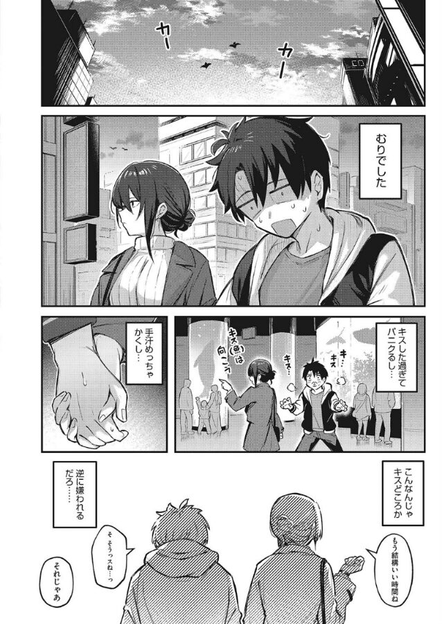 碧斗はクールビューティーの蓮さんと付き合いはじめて2ヵ月、5回目のデートのこの日、ある決意に燃えていた。それは、手をつないでキスまですること! 手つなぎまでは上手くいけたが、デート中は緊張しすぎてキスどころではなく、不甲斐ない自分に落ち込んでいた。そんな碧斗を他所に蓮さんが突然、ラブホに誘ってきた!? 急展開に焦る碧斗だが腹を括って二人で部屋に。蓮さんの超絶テクの手コキにめちゃめちゃ気持ちよく射精してしまった碧斗。蓮さんも初めてなのに自分の為に練習をしてくれたという言葉に感じ入り、蓮さんにキスをお願いすると……。