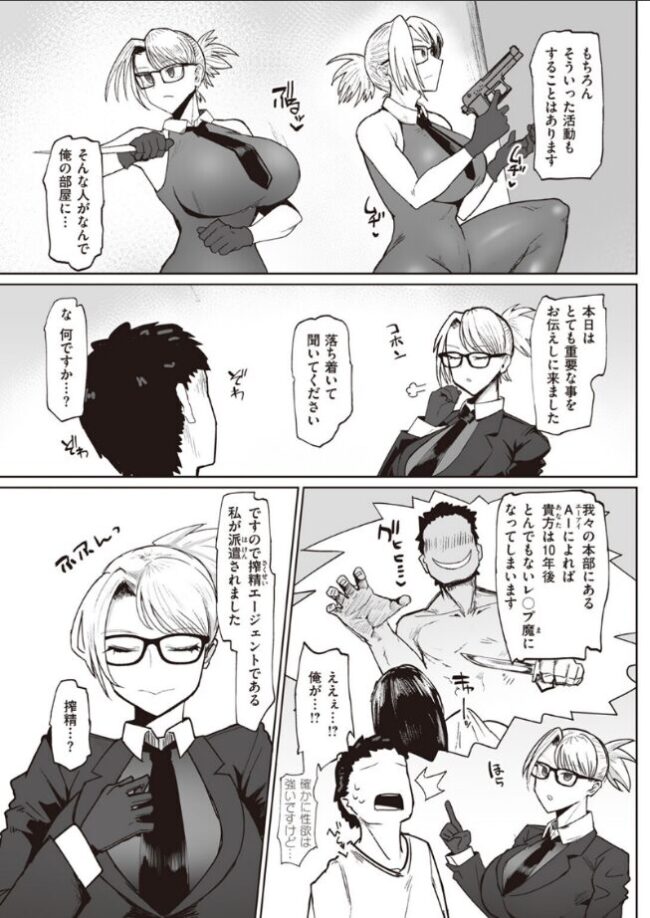 「貴方が正しい道を歩めるよう、暫くの間、私が搾精を担当させて頂きます」お気に入りのエロ漫画でシコっていると、なにもない空間から突然スーツを着たエージェント風の女が現れた!!彼女の名前は東雲(しののめ)。凶悪犯罪を防ぐための組織に所属しているらしい……。曰く、将来とんでもない犯罪者になるとAIで予測されたから、性欲を適切に管理して未来を変える……とのこと。手コキ・パイズリ・立ちバック……カラダを張った搾精がはじまる!!