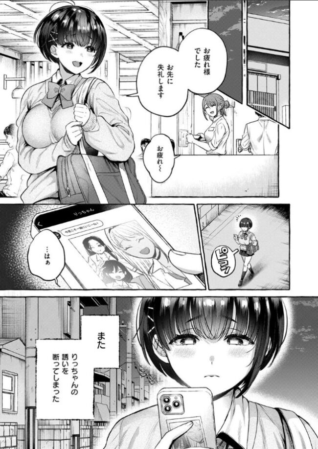 (りっちゃんに見られて おま〇こがどんどん熱くなって――)引っ込み思案で臆病でいつもひとりぼっちだった私に声をかけてくれたりっちゃん。そんな大事な友達であるりっちゃんが欲しがっていたネックレスをプレゼントするため、バイトに勤しむ日々を送っていた。遊びに誘われても、何度もバイトがあるからと断り続けていたある日、りっちゃんから「お金が欲しいなら良いバイトがある」と誘われて……。歪んだ友情なのか、執着なのか、依存なのか。ギャルの友達・りっちゃんの言うがままにP活を始めようとしてしまう気弱な少女のメイが行きつく先は――…大ボリューム前後編、スタート!!!!!