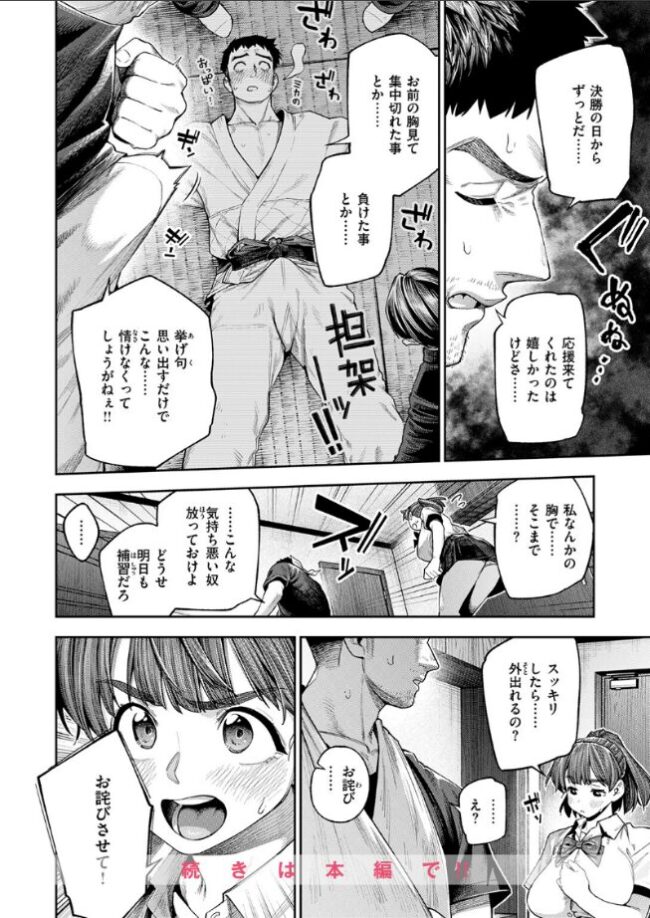 柔道大会の決勝戦。幼馴染のタケシから「優勝したら大事な話がある」と告げられたミカは全力で声援を送るが、勢い余ってシャツもブラも弾け飛んでしまった!まろび出たおっぱいに気を取られたタケシは一本負け。しかも受け身を取れず利き手を骨折してしまう。それ以来ミカのおっぱいが頭から離れず、骨折でシコることもできず常時勃起状態で部屋に引きこもるタケシ。こうなった責任を取るため、ミカは意を決してパイズリをすることになり……。