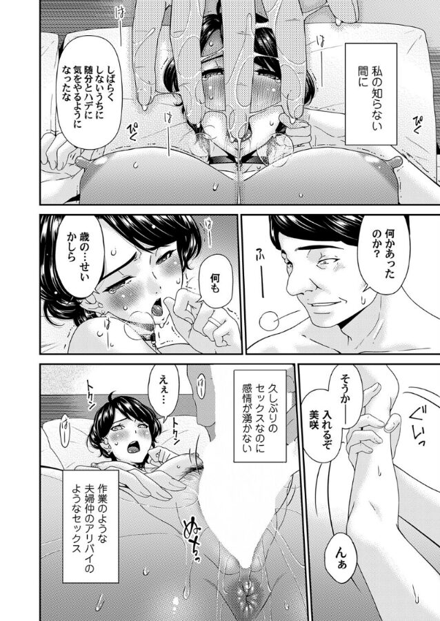1月30日に最新単行本『貴方の為にXXされて…』が発売となる唄飛鳥が描く新シリーズ第七話!会社で気分が悪くなり突然嘔吐する美咲。そういえば生理が来ていない……菅生に妊娠したかもと美咲は告げるとカレは喜んでくれたのだった。結婚している美咲にとって、このままではマズイ状況であり、カレに迷惑がかかると心が痛む。菅生は美咲の夫とセックスをしてみたら少しは誤摩化せるかもと提案する。息子も娘も帰って来ない夜、寝室で久々に夫を誘う美咲……。思い出した…夫のペニスの大きさを。昔、このペニスが苦痛だった……痛いだけのセックス。夫のゴツい指に愛撫されながら、彼との繊細なセックスと比較する美咲。しかし夫は昔から女を喜ばせるテクニックだけは上手かった。きっと今でも私の知らない所で、若い女にコレをしているのだろう…と美咲は思いつつも、指でイカされる美咲。久しぶりのセックスなのにまるで感情が湧かない作業のような夫婦仲のアリバイみたいなセックス……美咲は娘が生まれる前のあのときのようになると少しは思っていた……。夫にチンポを挿入され耐える美咲だったが、見た目以上に大きく感じる夫の苦痛なペニスが気持ちよく感じてしまう。カレのことを思い浮かべ現実を直視しないようにするが、夫のねちっこい愛撫で現実に戻され、美咲は声が出てしまいながらイってしまう。その声を聞いて喜ぶ夫は更に高揚し、美咲をまたイカせるように激しくピストンを繰り返す。そして妻のイキ顔を堪能しながら、膣内に射精をしたのだった。クタクタになりながらも目的を達成した美咲だったが……。