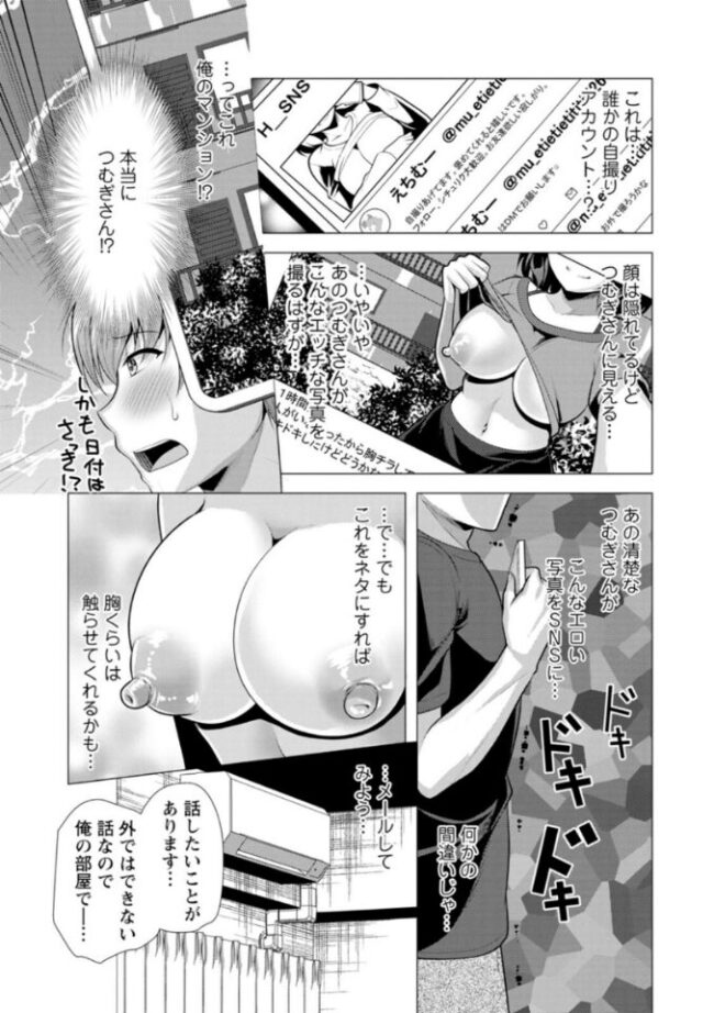 一人暮らしの大学生・真が仲良くなったご近所の人妻・つむぎさんは、なんとSNSにHな自撮りを公開していた! その事実を口外しないことと引き換えに彼女と関係を持った真だったが、意外にも彼女からフォロワー数を増やすためハメ撮りに協力して欲しいと頼まれる。撮影しながらのSEXにハマっていく真。そしてつむぎさんへの想いも高まってゆき…。彼女がSNSにこだわる訳とは? そして二人の関係の行方は!?
